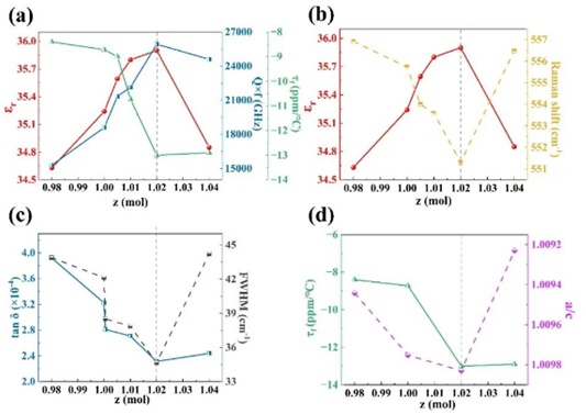 (Sr0.7Ca0.3)z(Zr0.95Ti0.05)O3(0.98≤z≤1.04)陶瓷的介电特性、Ag峰的拉曼频移、FWHM、晶格结构a/c与其非化学计量比z的相互关联图