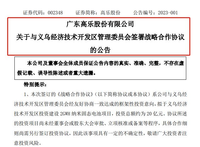 高乐股份拟20亿元投建纳米固态电池项目