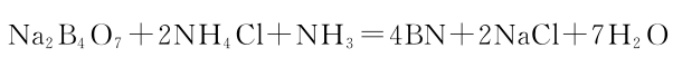 利用固相反应法制备六方氮化硼,是指将含硼化合物和含氮化合物均匀混合在一起,在持续高温状态下进行固相反应,将煅烧后的产物经后续的除杂处理得到结晶度高和粒度均匀的氮化硼粉体。用固相反应法来制备六方氮化硼,通常使用硼砂(Na2B4O7)和氯化铵(NH4Cl)作为原料,在氨气氛围下加热到900~1100℃下保温5h,其反应方程式如下: