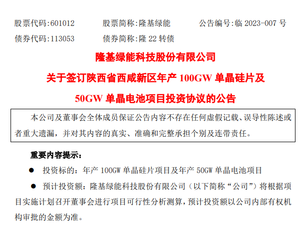 中国粉体网讯 隆基绿能(601012)1月17日晚间公告,公司与陕西省西咸新区开发建设管委会、陕西省西咸新区泾河新城管委会签订《投资合作协议》,就公司在陕西省西咸新区投资建设年产100GW单晶硅片项目及年产50GW单晶电池项目达成合作意向。
