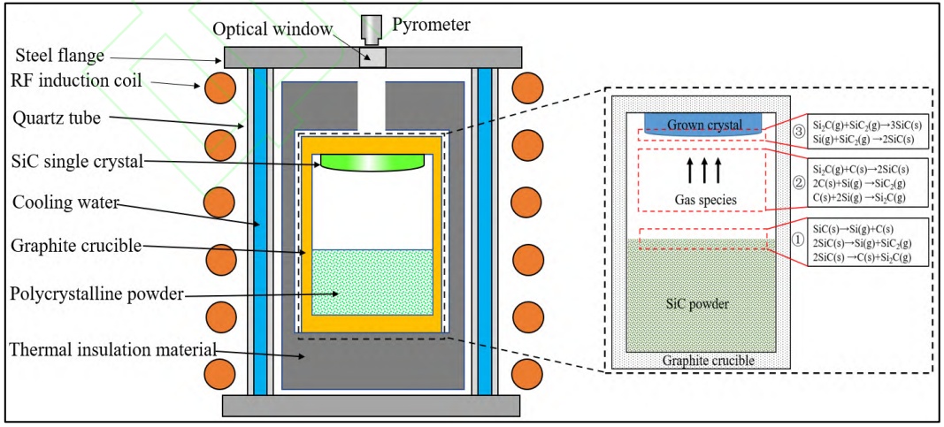 目前,物理气相传输法(PVT法)仍然是SiC衬底的国际主流制备方案,PVT法生长SiC晶体的生长装置及长晶过程如下图所示。该过程主要由三个步骤组成:①坩埚底部SiC原料的分解与升华;②气相组分从料面传输至上部籽晶表面;③在籽晶生长面沉积并结晶。
