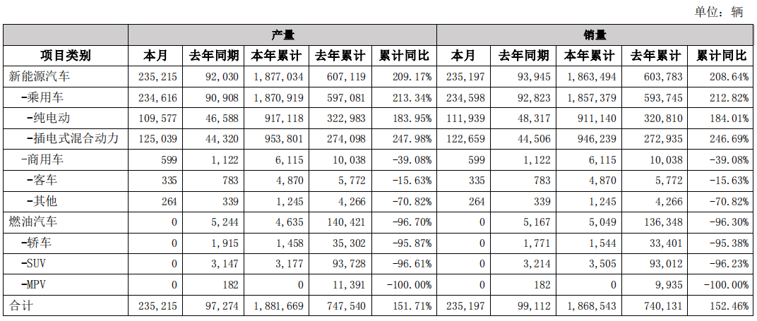 比亚迪表示,业绩大幅增长的主要原因是新能源汽车行业持续爆发式增长,公司作为新能源汽车行业领军企业,克服复杂严峻的外部环境及诸多超预期因素冲击,新能源汽车销量同比实现强劲增长,勇夺全球新能源汽车销量第一,推动盈利大幅改善,并有效缓解上游原材料价格上涨带来的成本压力。