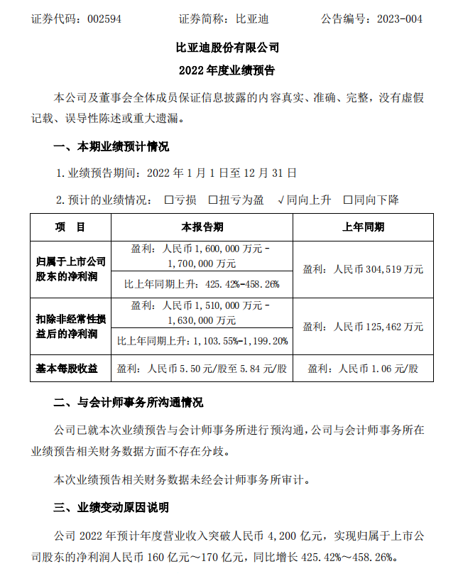 中国粉体网讯 1月30日晚间,比亚迪发布2022年度业绩预告,预计2022年年度营业收入突破人民币4200亿元,实现归属于上市公司股东的净利润人民币160亿元~170亿元,同比增长425.42%~458.26%。