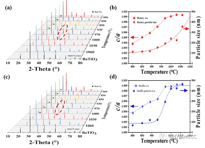 在此背景下,深圳电子材料院张蕾副研究员团队成功采用两步煅烧结合回转炉煅烧的方法合成了颗粒均匀、高四方性的BaTiO3超细粉体。反应动力学研究发现,回转炉提高了固相反应的传热效率,增加了Ba2+和Ti4+的点接触面积,降低了两者的扩散速率,使扩散成核生长速率大于BaCO3的分解速率,从而提高了Ba2+和Ti4+的反应活性,进而提高BaTiO3粉体的四方性。通过优化工艺、理解反应机理,采用两步辅助回转炉煅烧法成功地制备了平均粒径为250nm、四方度(c/a)为1.0096的BaTiO3超细粉体。该工作克服了固相高温煅烧引起的粗结晶和团聚问题,提高了粉体的四方性,为固相法生产高四方性BaTiO3超细粉体提供了新思路。