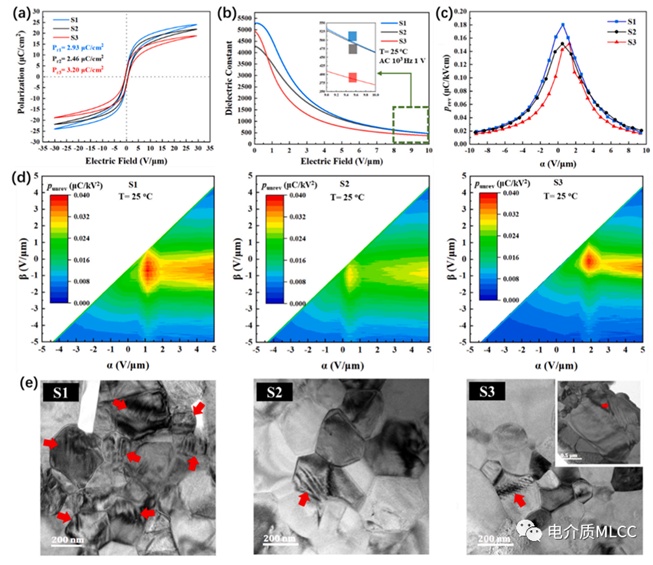 图注:(a)直流偏压场的介电常数依赖性(插入:8-10V/μm),(b)P-E环路,(c)可逆和(d)不可逆FORC分布的演化,(e)超薄MLCCs芯片的TEM图像。