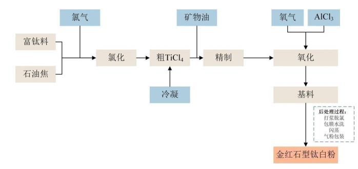 在现有技术条件下,钛白粉的商业生产方法,无论是硫酸法还是氯化法,生产工艺冗长,技术纷繁复杂,涵盖了几乎所有的无机化工生产单元操作,涉及众多科学与技术领域,非简单的单一无机金属氧化物的生产范畴所能企及。其中,氯化法钛白由于其工艺流程短、环境污染小、能耗低、生产能力易于扩大和劳动生产率高等优点,得以迅速发展。