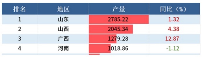 产量方面,国家统计局数据显示,2022年中国氧化铝产量8186.2万吨,同比增长5.6%。其中,2022年山东产量为2785.22万吨、山西产量2045.34万吨、广西产量1279.28万吨和河南产量1018.86万吨,产量分别同比增长1.32%、4.38%、12.87%和-1.12%。