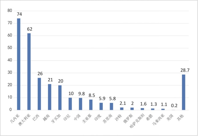 世界主要国家铝土矿储量分布表(万吨)(数据来源:USGS)
