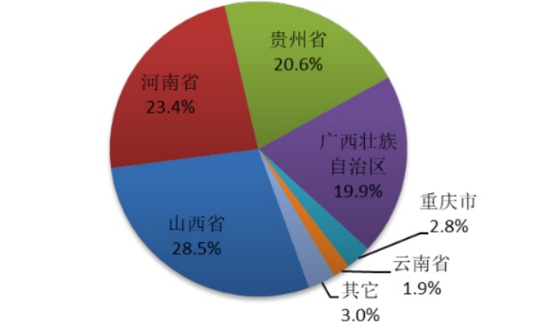 我国铝土矿查明资源储量分布于19个省(区),资源分布比较集中的有山西、广西、贵州、河南、重庆以及云南,前4个省区的铝土矿资源储量占全国的90%以上。