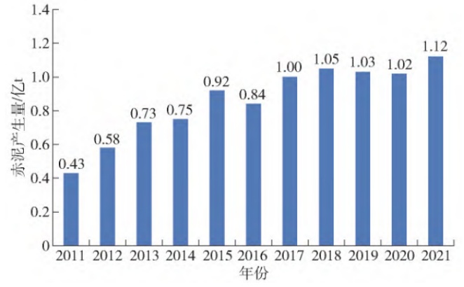 赤泥是氧化铝生产过程中产生的强碱性固体废渣,含大量氧化铁,显红色。中国作为氧化铝生产大国,根据国家统计局等相关资料显示,自2017年起,我国每年产生的赤泥均超过1亿t。