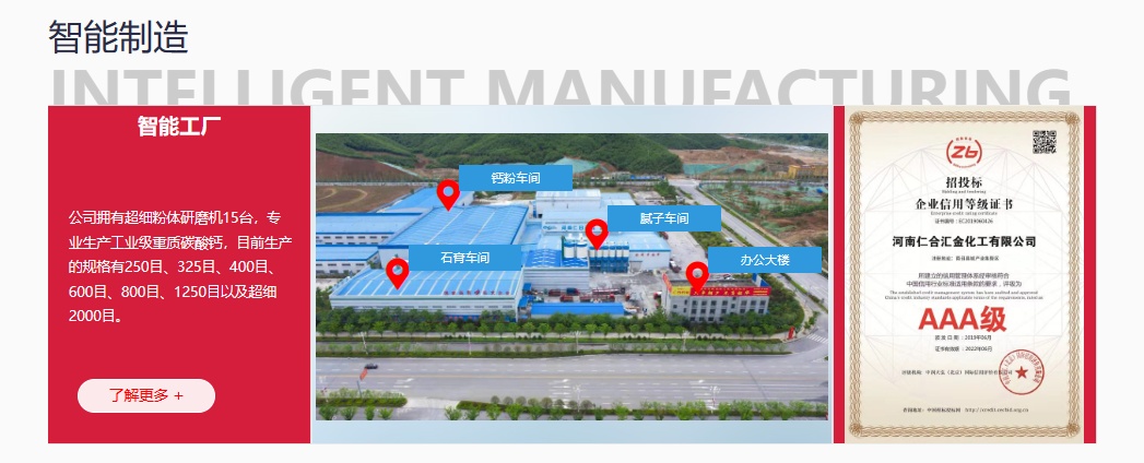 河南仁合汇金化工有限公司,公司成立于2010年12月,位于有“中国钙都”之称的河南省南召县,距二广高速路口一公里,交通便利,位置优越,厂区占地面积约50余亩左右,环境优美,现有职工200余人左右。是一家集矿山开采,重质碳酸钙生产,建筑辅材技术研发,生产,销售于一体的高新技术企业。