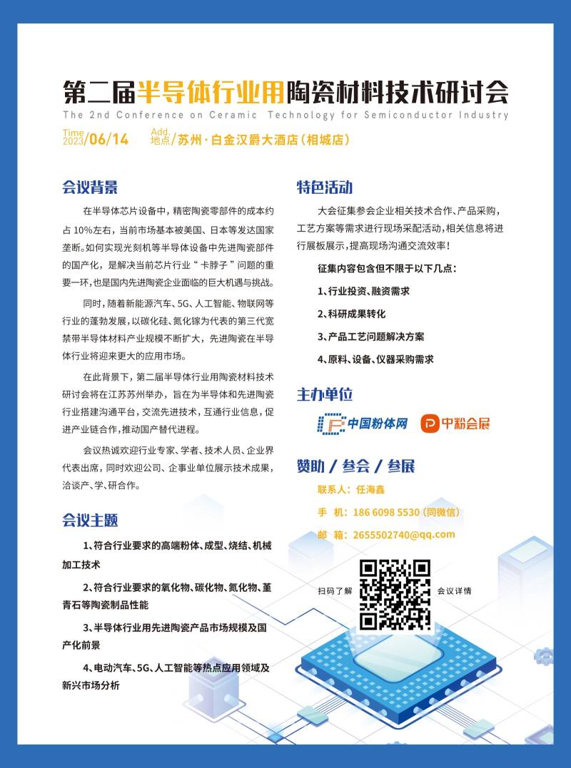从第二届半导体行业用陶瓷材料技术研讨会组委会获悉,本届会议将于2023年6月14日在苏州举办。郑州市立新实业有限公司作为参展单位邀请您共同出席。