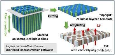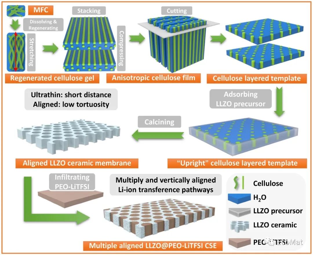 图1各向异性纤维素薄膜、垂直排列的LLZO陶瓷膜以及CSE的制备过程示意图