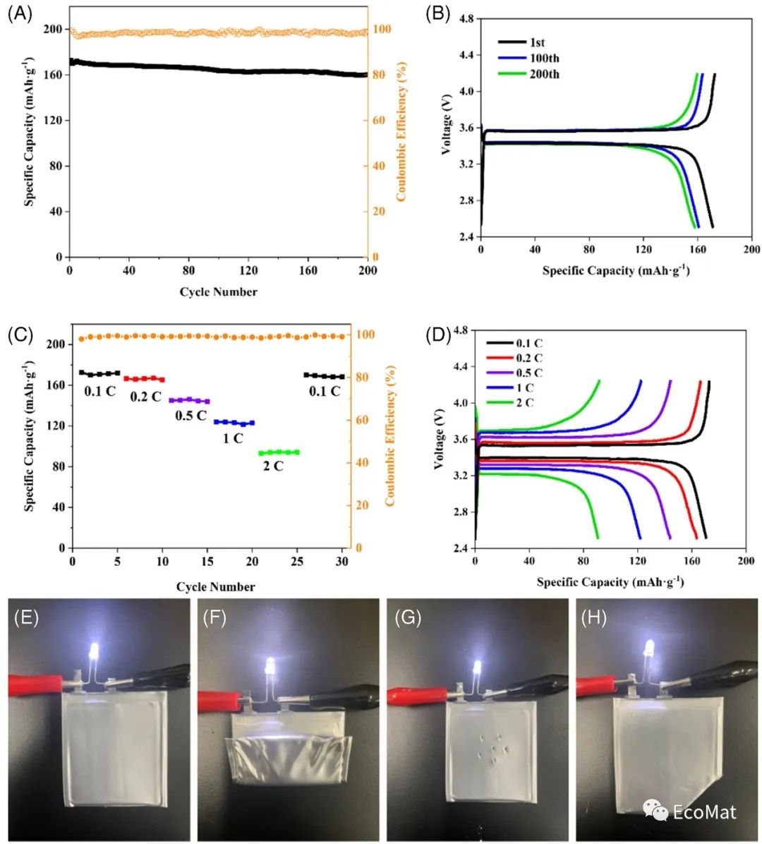 本工作首次开发了一种“垂直”纤维素分层模板,可以通过纤维方向和各向异性纤维素薄膜的厚度来精确控制。利用这种模板制备了具有低扭曲度和均匀孔隙度的垂直排列的Li7La3Zr2O12(LLZO)陶瓷膜。将聚对苯二甲酸乙二醇酯(PEO)聚合物纳入LLZO结构中,制备得到柔性复合固态电解质(CSEs),并表现出优异的力学强度、高离子电导率(2.1×10-4Scm-1)以及与锂负极优良的界面兼容性。以该CSEs组装的LiFePO4/Li全电池在200圈循环后仍能达到172.3mAhg-1的放电容量,库仑效率超过99%,容量保持率为93.1%。这些结果表明,对垂直纤维素分层模板尺寸和结构的精细设计在制备高安全、高性能柔性LLZO@PEO-LiTFSICSEs方面具有良好的应用前景。