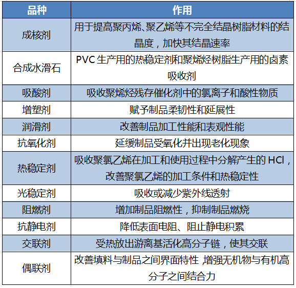 目前,树脂及改性塑料材料涉及的主要高分子材料助剂品种及相应的作用具体如下: