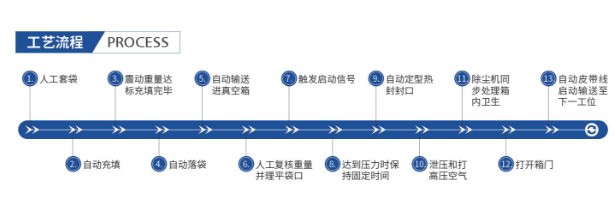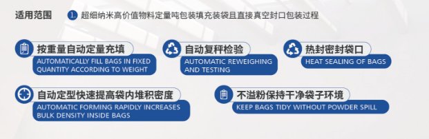 此外,此组合具有计量精度高、脱气充填使物料密实、智能复秤检验等特点,智能复秤可实现自动添加物料,快速弥补称重误差以及吨包袋整体抽真空、快速定型、自动热封,大幅减少物料体积等优点。