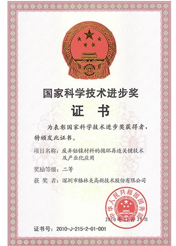 格林美废弃钴镍材料的循环再造关键技术及产业化应用,是中国在该领域居世界领先地位的核⼼技术,于2010年获得国家科技进步二等奖。2020年,格林美循环再造的超细钴粉入选第五批全国制造业单项冠军产品。