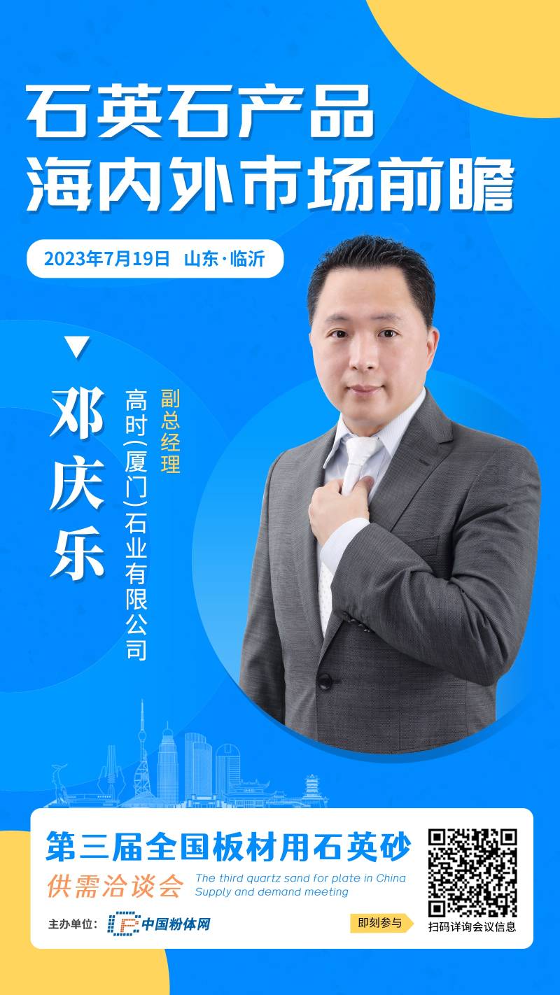 2023年7月,中国粉体网将在山东临沂举办“第三届全国板材用石英砂供需洽谈会”。我们有幸邀请到高时(厦门)石业有限公司的副总经理邓庆乐,他将带来题为《石英石产品海内外市场前瞻》的报告。