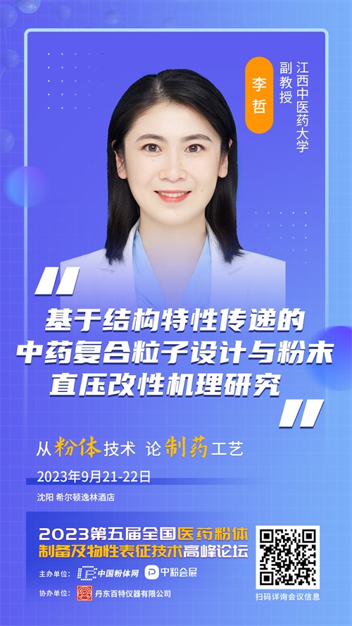 2023年9月21-22日,中国粉体网以“从粉体技术,论制药工艺”为主题,将在辽宁沈阳希尔顿逸林酒店举办“第五届全国医药粉体制备及物性表征技术高峰论坛”,届时将邀请来自江西中医药大学李哲副教授作《基于结构特性传递的中药复合粒子设计与粉末直压改性机理研究》报告,报告主讲人基于粒子设计原理,采用多种共处理工艺对中药粉体的功能性质进行改善,建立了系统的结构表征体系,并从多层次、多维度定量表征制剂原料、中间体、产品的结构参数,总结基于结构特性参数的共处理改性理论,为构建中药制剂结构药剂学理论体系,指导中药固体制剂产品的设计与开发奠定基础。