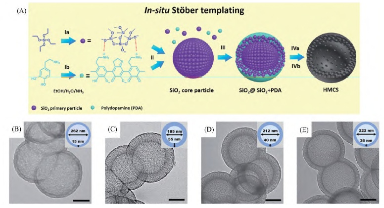 聚合物颗粒由于其尺寸均一、分散性好等优点被广泛用作硬模板。Stöber法是一种经典的制备SiO2胶体颗粒的方法,研究者基于Stöber法,实现了模板到前驱体包覆的连续性生产,简化了模板法合成中空介孔碳球(HMCS)的工序[图1(A)]。他们首先将正硅酸乙酯加入到包含乙醇、超纯水和一水合氨的混合液体中并混合均匀,随后加入盐酸多巴胺经过搅拌、洗涤、烘干获得PDA-SiO2颗粒,最终进行热处理及NaOH洗涤去模板处理。该方法相对于其它硬模板法的优势在于:其结构可调性强(壳层厚度可控范围为15-55nm,内径为185-262nm),方法简易,可操作性强[图1(B)-(E)]。