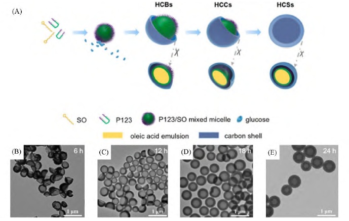 研究人员以核糖作为碳前驱体,与油酸钠、醇类多聚物P123共同水热处理,以软模板法得到了尺寸分布均匀、颗粒分散的纳米烧瓶结构,该颗粒比表面积高达2335m2/g。他们还提出了模板与生物质之间存在协同效应诱导的动态生长机制:核糖提供的酸性将油酸钠转化为油酸纳米乳液并作为模板和良性溶剂,表面活性剂P123有助于纳米乳液分散的同时,诱导了碳壳层的破裂,提供了中间产物进入的通道,最终形成了独特的高比表面积的中空结构。在此基础上,有人通过调节反应时间,研究了软模版法制备中空碳球的动态形成过程[图2(A)]。他们发现随着时间的变化,该结构经历了中空碳碗、胶囊和球体的动态形成过程[图2(B)-(E)]。在合成过程中,双表面活性剂(P123与油酸钠)相互作用作为软模板,碳前驱体葡萄糖将经过水合、聚合和芳构化3个阶段。当芳香族化合物浓度达到临界过饱和态时即开始成核,并沿界面逐渐扩展,致使碳层发生变化,因此,可以通过控制反应时间来获得不同形貌的中空碳颗粒。十六烷基三甲基溴化铵(CTAB)作为表面活性剂,同样具备调节软模板的表面粗糙度和结构的作用。
