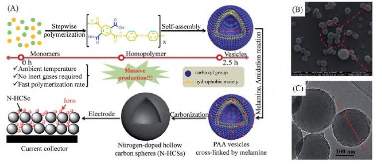 众所周知,杂原子掺杂会由于电子效应、协同作用从而带来物理化学性质的变化。与硬/软模板法相比,自模板法在合成工序更为简易的情况下同样可以完成杂原子掺杂。有研究者利用两亲性均聚物聚酰胺酸(PAA)的自组装特性,在不添加模板的情况下通过滴注合成了PAA囊泡,利用三聚氰胺完成交联后在惰性气氛中碳化得到氮掺杂的中空碳球(N-HCSs)(图3)。在此基础上,研究人员以聚酰亚胺为前驱体,设计了一种简易可控的溶剂热法路线:通过控制适当的聚合时间和溶剂环境,使得聚酰亚胺纳米片完成自组装,随后洗涤碳化获得高比表面积的、分级多孔结构的氮掺杂中空碳微球。