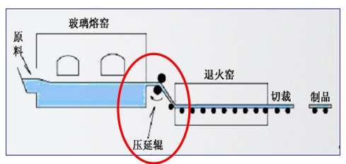 1、玻璃在两个压延辊的挤压作用下挤出成型