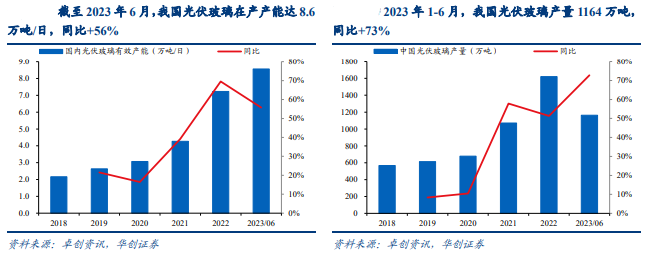 2022年,我国光伏玻璃产量约占全球产量的90%。据卓创资讯数据,2022年我国光伏玻璃新增在产产能约3.0万吨/日,同比增长147%。2022年底我国光伏玻璃在产产能达7.2万吨/日,同比增长70%;截至2023年6月我国光伏玻璃在产产能8.6万吨/日,同比增长56%。产出方面,2022年我国光伏玻璃产量1621万吨(折合日产量4.4万吨/日),同比增长51%。2022年全球新增光伏装机240GW,同比增长37%,我国光伏玻璃产能及产量增速均高于光伏装机增速。