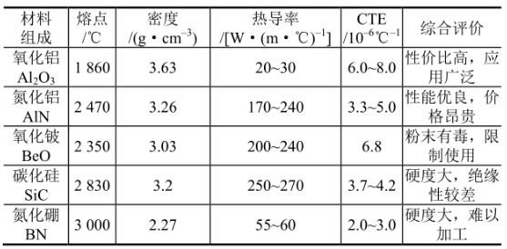 目前常用电子封装基板主要可分为高分子基板、金属基板(金属核线路板,MCPCB)和陶瓷基板几类。对于功率器件封装而言,封装基板除具备基本的布线(电互连)功能外,还要求具有较高的导热、耐热、绝缘、强度与热匹配性能。因此,高分子基板和金属基板使用受到很大限制;而陶瓷材料本身具有热导率高、耐热性好、高绝缘、高强度、与芯片材料热匹配等性能,非常适合作为功率器件封装基板,目前已在半导体照明、激光与光通信、航空航天、新能源汽车等领域得到广泛应用。
