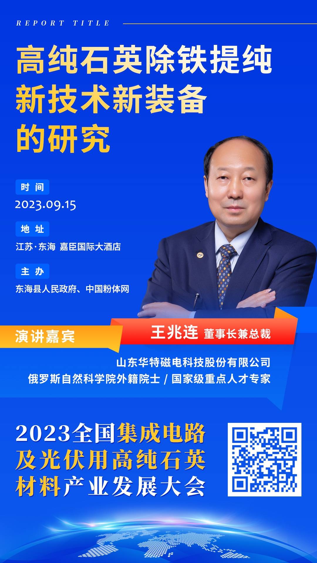 2023年9月15日,中国粉体网将在江苏东海举办“2023全国集成电路及光伏用高纯石英材料产业发展大会”。届时,山东华特磁电科技股份有限公司董事长兼总裁王兆连将带来题为《高纯石英除铁提纯新技术新装备的研究》的报告,华特磁电在磁选装备领域深耕30年,有着丰富的选矿经验。届时,王董将为我们介绍哪些新的除铁工艺和装备呢?让我们拭目以待。