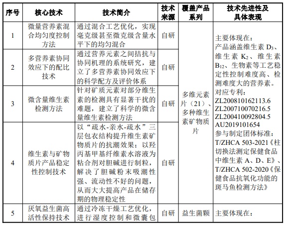 截至招股说明书出具日,公司拥有授权专利56项,其中发明专利6项、实用新型专利14项、外观专利35项,澳大利亚专利1项,形成了多营养素协同效应下的配比技术、微量营养素混合均匀度控制方法、维生素与矿物质片产品稳定性控制技术、微含量维生素检测方法等一整套涵盖产品配方体系、生产工艺体系、品质控制与检验体系的核心技术体系。以微量营养素混合均匀度控制方法为例,该技术解决了20多种密度不一样的原辅料成分可以均匀分布在每一片1克重的药片中的难题,保证了产品的质量可控性。