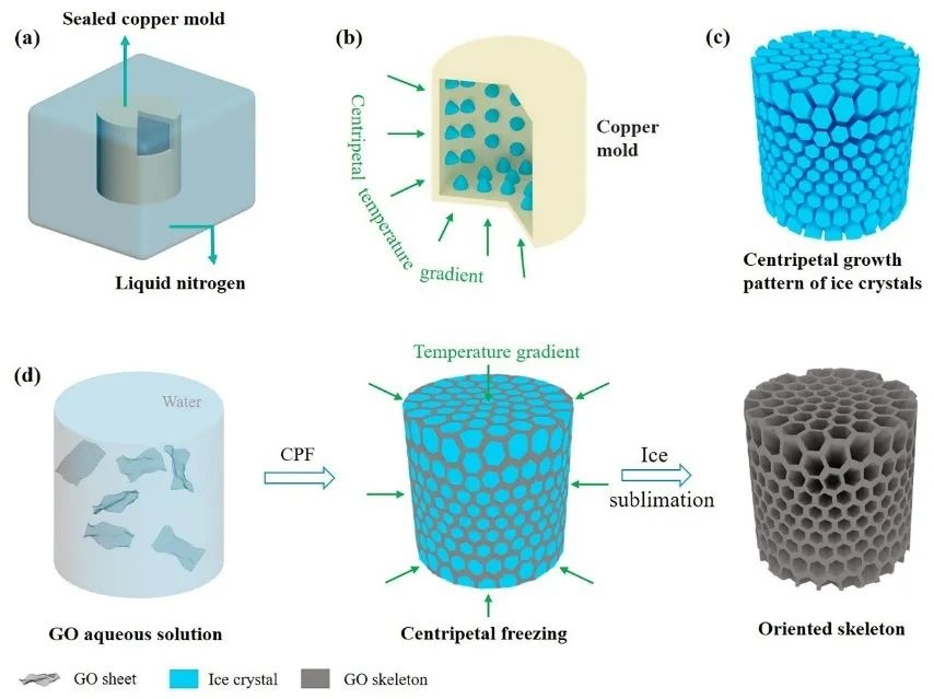 前期,团队利用向心冷冻铸造技术,设计相互垂直的温度梯度以改变冰晶的生长方向,最终形成内凹向心结构,实现了负泊松比效应和优异弹性。该成果以“Tailoring centripetal metamaterial with superelasticity and negative Poisson’s ratio for organic solvents adsorption”为题发表在Science Advances(DOI: 10.1126/sciadv.abo1014)。上海硅酸盐所2019级博士研究生田力为第一作者,董绍明研究员和杨金山研究员为论文通讯作者。