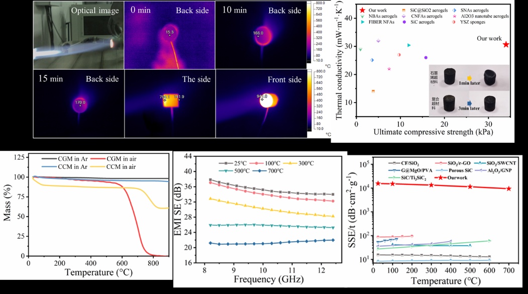 在此基础上,团队结合向心冷冻铸造及化学气相沉积技术,形成内凹取向结构和“BN/石墨烯/BN”三明治片层,获得具有层次结构的陶瓷基复合材料,实现优异的抗压缩性能,具有负泊松比和高比强双重超材料属性。依赖于陶瓷组分的保护作用,该材料具有高效的隔热性能,高温下具有良好的电磁干扰屏蔽性能。在700℃时,比屏蔽效率(SSE/t)可达9416 dB·cm2·g-1。