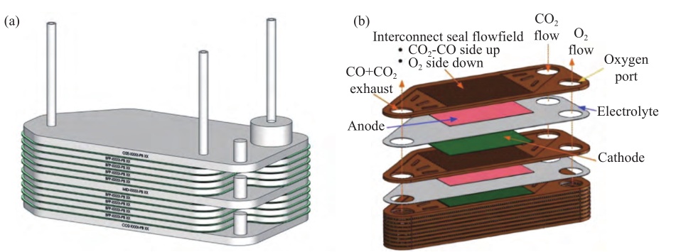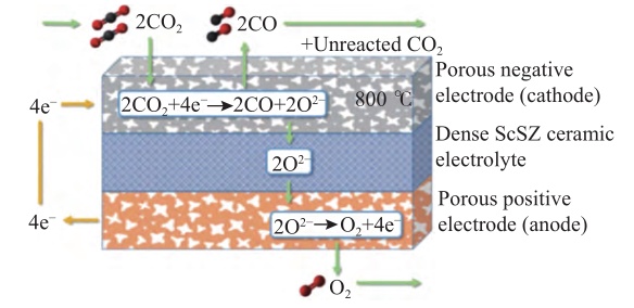 实现以上反应的关键装置又叫固体氧化物电解池(Solid Oxide ElectrolysisCell,SOEC),单个SOEC主要由三部分组成,致密的电解质、多孔的阴极和阳极,三者呈三明治结构。在外电场的作用下,CO2在SOEC阴极分解为CO和氧离子,氧离子通过电解质中存在的氧空位传递到阳极,在阳极失去电子生成氧气。其电极反应如下: