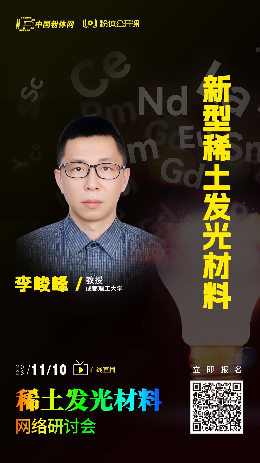 中国粉体网讯 稀土发光材料是稀土资源髙值化的重要应用领域,其具有多种颜色、高亮度、高效率、长寿命等优点,在光电子、生物医药、环境保护等领域都得到了广泛应用。为进一步探索稀土发光材料新的制备方法,开拓稀土发光材料的新应用,粉体公开课特举办稀土发光材料网络研讨会,给大家提供一个线上交流学习的平台。