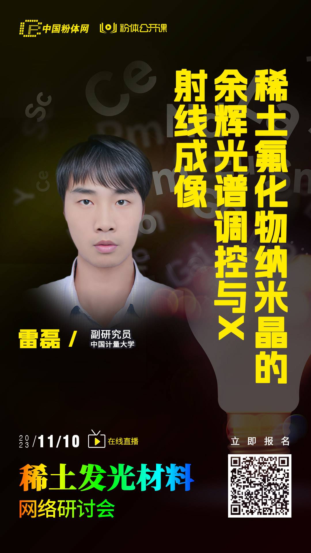 中国粉体网讯 稀土发光材料是稀土资源髙值化的重要应用领域,其具有多种颜色、高亮度、高效率、长寿命等优点,在光电子、生物医药、环境保护等领域都得到了广泛应用。为进一步探索稀土发光材料新的制备方法,开拓稀土发光材料的新应用,粉体公开课特举办稀土发光材料网络研讨会,给大家提供一个线上交流学习的平台。