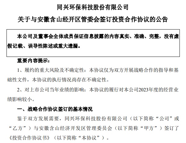 中国粉体网讯 2023年11月11日,同兴环保发布公告,鉴于双方发展需要,公司与安徽含山经济开发区管理委员会签订了《投资合作协议书》。