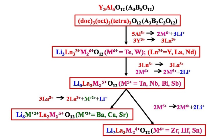 石榴石本身是一种通式为A3B2(SiO4)3的硅酸盐,如硅酸铝钙Ca3Al2Si3O12等。而石榴石型电解质并不是这种硅酸盐,而是用各种金属原子代替硅原子并具有相同结构的无机非金属化合物。最初使用的石榴石型电解质为Y3Al5O12(YAG),后随着对石榴石型电解质组分的不断探索和尝试,逐渐演化和诞生出了多种石榴石或类石榴石型氧化物。众多化学成分和计量式各不相同的含锂石榴石电解质及其发展关系如下图所示。