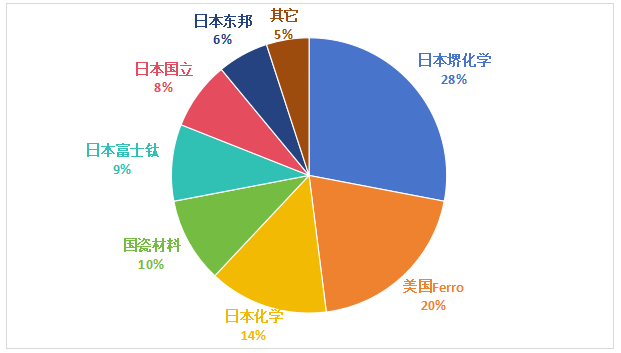 自20世纪80年代以来,日本在先进陶瓷材料科研、制备方面占有领先、突出的地位,在电子陶瓷、光导纤维、高韧性陶瓷等先进陶瓷材料方面,日本均处于领先地位。日本生产的先进陶瓷敏感元件已占据国际市场主要份额,包括热敏、压敏、磁敏、气敏、光敏等在内的各种先进陶瓷产品垄断着大部分市场;在泡沫陶瓷、超塑性陶瓷、塑胶复合陶瓷以及各种先进陶瓷材料与陶瓷部件研发,高性能陶瓷电池、陶瓷发动机等研发开发方面,也均处于领先地位。随着多年来在先进陶瓷领域的技术积累,日本诞生了一大批在行业内拥有重要话语权的大型陶瓷企业,例如日本京瓷、村田、东芝、日本特殊陶业、NGK、昭和电工等等,特别是日本京瓷和村田等年销售达千亿级的先进陶瓷跨国公司在全球具有重要影响力。目前,日资企业在全球先进陶瓷领域市场份额达50%左右。