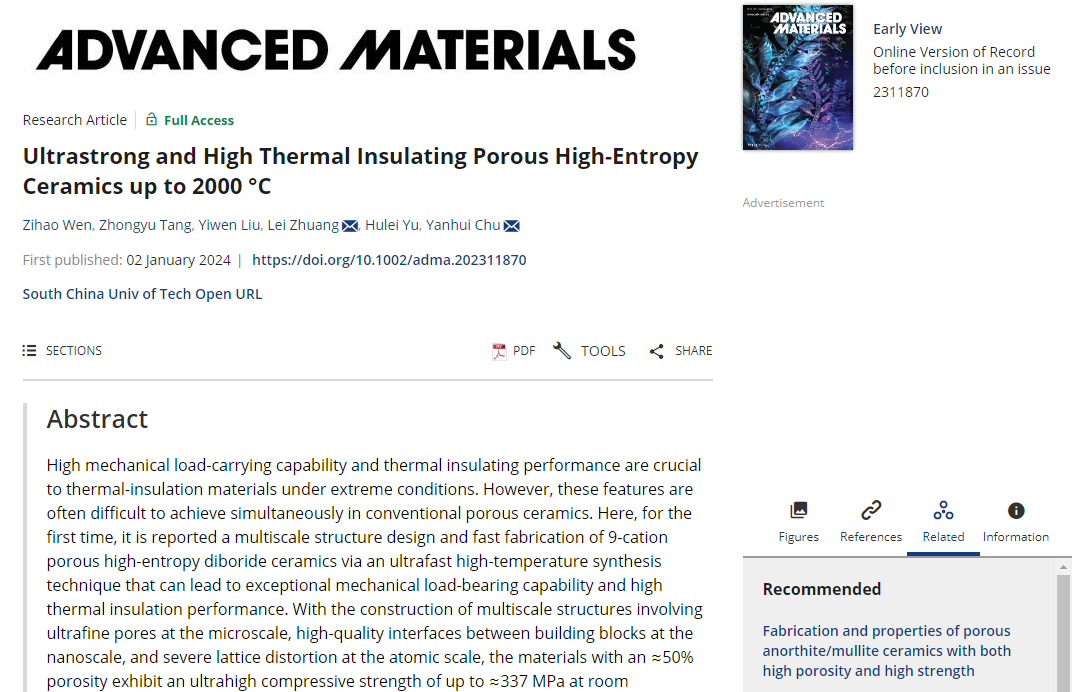 中国粉体网讯 近日,华南理工大学材料科学与工程学院研究员褚衍辉团队通过多尺度结构设计,成功制备出兼具超强力学强度和高隔热的高熵多孔硼化物陶瓷材料。同时,该材料还展现出了2000℃高温稳定性。相关成果发表于《先进材料》。