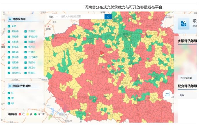 其中,河南明确分布式光伏开发红、黄、绿区域,按季度向社会公布,并适时缩短测算公布周期;优先支持绿色区域内的分布式光伏项目,黄色、红色区域内的分布式光伏项目,待落实消纳条件后,再行开发建设。根据河南省能源大数据中心公布的情况,河南不同区域的承载力情况如下图所示,河南整体上已经处于红黄状态,绿色区域较小。