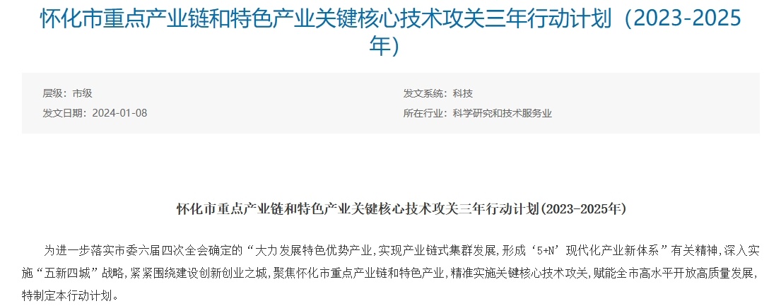 中国粉体网讯 2024年1月8日,湖南省人民政府印发《怀化市重点产业链和特色产业关键核心技术攻关三年行动计划(2023-2025年)》。