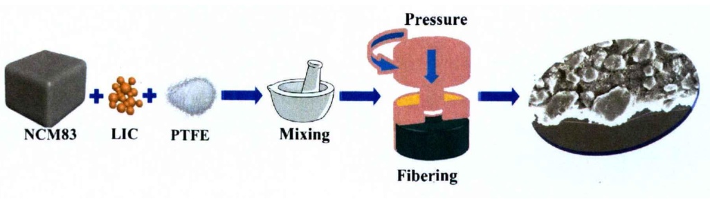 王晶通过称取一定比例的NCM83、Li3InCl6和PTFE在研钵内混合均匀,之后转移到钢质模具中在350MPa的压强下混合使PTEF纤维化,最后再压制成型,得到PTFE干法电极。该电极可以准确获得极片活性物质的质量,使得正极颗粒与电解质之间,颗粒与颗粒之间连接得更加紧密;有效减缓充放电过程中体积变化造成的正极与电解质之间接触失活。