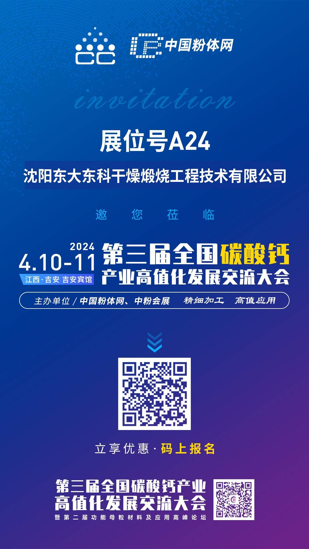 由中国粉体网主办的“2024第三届全国碳酸钙交流会”将于2024年4月10-11号在江西吉安举办沈阳东大东科干燥煅烧工程技术有限公司邀您一同参加。