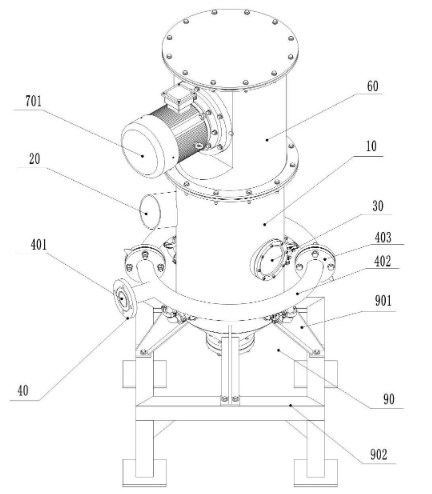 摘要:本发明公开了一种锂电材料制备用流化床气流粉碎分级机,包括粉碎腔、给料管、视镜、分流装置、喷嘴装置、分级腔、分级装置、底腔和主机支架,粉碎腔、分级腔和底腔由上至下依次布置,给料管倾斜连接粉碎腔的侧部,分流装置包括主流管道、环形管道和多根分流管道,环形管道的底部设有多个圆孔,分流管道连接圆孔和喷嘴装置,喷嘴装置包括拉瓦尔喷嘴、喷嘴接管、管套、多个喷嘴套环和喷嘴安装法兰,拉瓦尔喷嘴的接头上设有外螺纹,喷嘴接管的内壁上设有内螺纹,内螺纹和外螺纹相配合,多个喷嘴套环设于拉瓦尔喷嘴和喷嘴接管之间,管套设于喷嘴接管的进口处。与现有技术相比,本发明能够实现流化床气流粉碎机对锂电材料的快速粉碎。