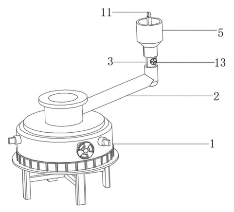 摘要:本实用新型涉及粉碎机进料技术领域,具体公开了一种进料结构及扁平式气流粉碎机,包括:粉碎机主体侧面设置有进料管,进料管表面设置有定量管,定量管表面设置有储料管,储料管内设置有拉杆,拉杆一端设置有密封盖;有益效果为:本实用新型提出的一种进料结构及扁平式气流粉碎机,使用时当需要对粉碎机主体内部进行加料时,拉动拉杆时密封盖向上提起,这样就可使储料罐内的物料流入定量管内,当流入到合适的量后在送开拉杆时密封盖封堵住储料罐,然后打开开关阀就可将定量管内的物料流入进行粉碎机主体内,简单方便,这样避免了传统的粉碎机主体主要利用漏斗式的进料斗进行进料,缺少定量装置,无法控制加入的物料量的问题。