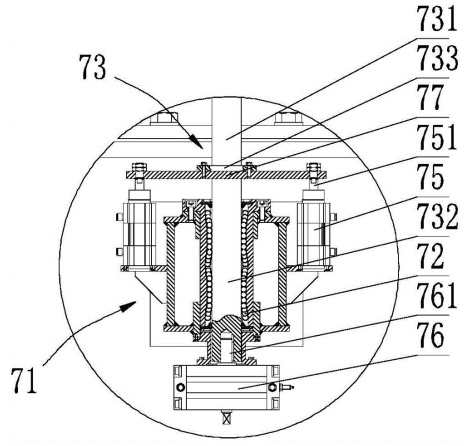 摘要:本实用新型提供的大型流化床式气流粉碎机,包括机座、筒体、配气盘、电机、出料器、顶盖、快拆机构,顶盖罩设在筒体上部的分级筒顶部,其边缘通过锁紧螺栓与分级筒连接,快拆机构连接顶盖中部和分级筒外壁,其包括连接在分级筒外壁上的基座、设于基座内的直线轴承、可升降且可转动地穿设在直线轴承内的顶杆、用于连接顶杆和顶盖的连接板,以及连接在基座上的升降气缸和旋转气缸,通过使顶杆中部与升降气缸的气缸杆相连接,使顶杆下端部可上下移动地套设在旋转气缸的旋转轴上,在拆下锁紧螺栓后,能够通过升降气缸动作,使顶杆向上顶起顶盖,再通过旋转气缸动作,即可带动顶杆转动,使顶盖从分级筒的顶部移开,顶盖拆卸方便、拆卸过程安全性好。