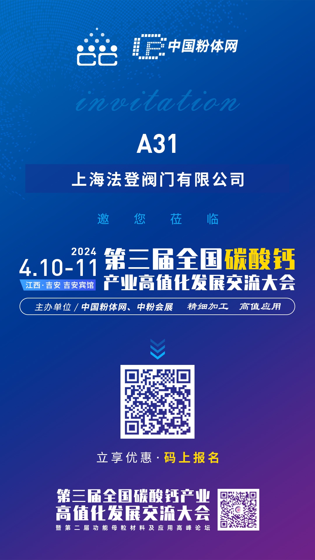 由中国粉体网主办的“2024第三届全国碳酸钙交流会”将于2024年4月10-11号在江西吉安举办,上海法登阀门有限公司邀您一同参加。