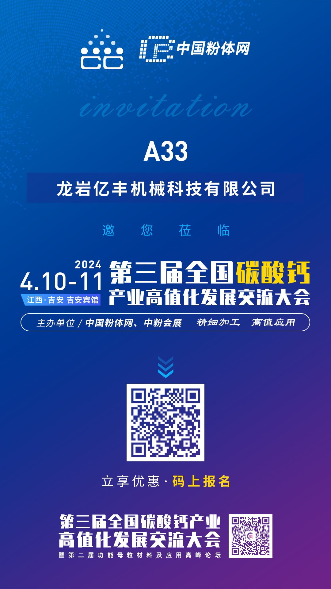由中国粉体网主办的“2024第三届全国碳酸钙交流会”将于2024年4月10-11号在江西吉安举办,龙岩亿丰机械科技有限公司邀您一同参加。