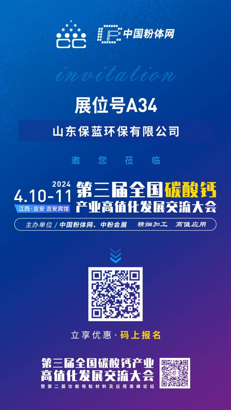 由中国粉体网主办的“2024第三届全国碳酸钙交流会”将于2024年4月10-11号在江西吉安举办,山东保蓝环保邀您一同参加。
